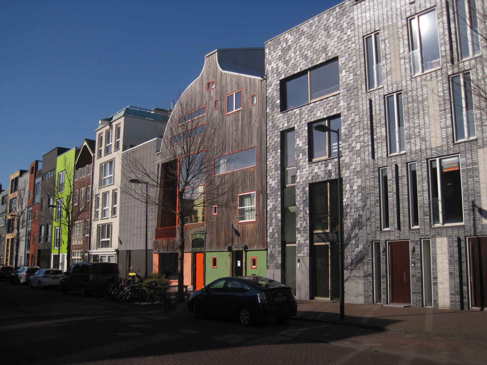 Maar op het welstandsvrije deel mocht gekleurd worden! Het ziet er best levendig uit. Het voor mij leukste huis heeft een soort klokgevel van hout met een spannende tweede gevel. Ok de kleuren en materialen spreken mij aan. Dat is niet het geval met de knalgroene kleur van de gevel die ook ergens in het rijtje staat. Al met al is het kleurenpallet in de vrijstandsvrije gedeelten van deze buurt niet gigantisch bont, maar prettig afwisselend naar mijn smaak.