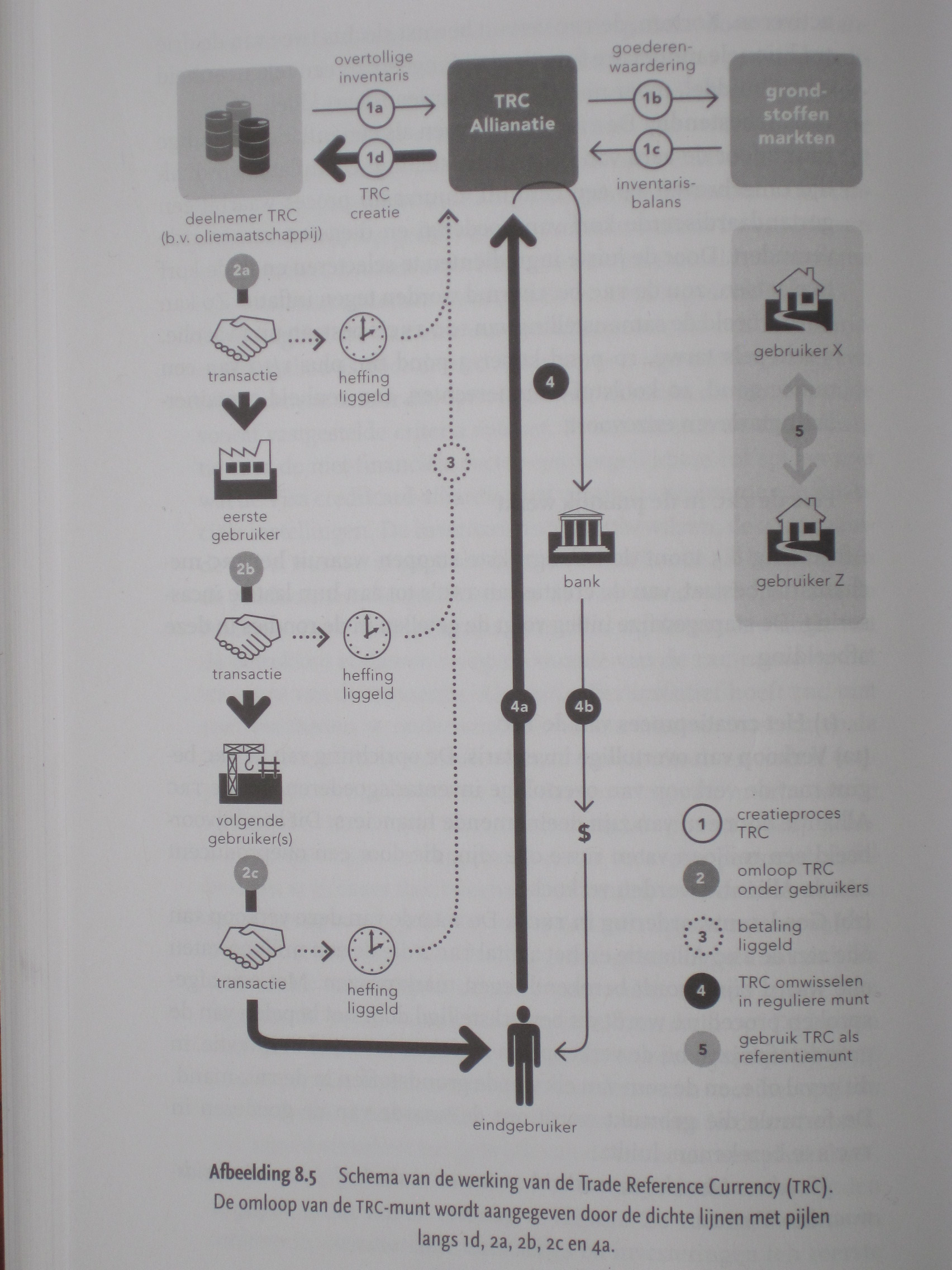 De TRC is een privaat uitgegeven ‘handelsreferentievaluta’, die een toeslag in de vorm van liggeld vraagt. Hij is volledig ondersteund door een standaardpakket van een dozijn van de belangrijkste goederen en diensten op de wereldmarkt. Bijv. cacao, koper, tarwe, CO2-uitstootrechten, enz. De waarde van dit pakket is veel stabieler dan van een nationale valuta. Internatonaal handelende bedrijven kunnen hun overtollige inventarisgoederen aan de TRC Alliantie verkopen, bijv. een miljoen vaten olie, die ze waardeert op grond van de prijs die het standaardpakket waard is. De Alliantie crediteert de rekening van de verkoper met als rekeneenheid de waarde van het standaardpakket. Stel dat de voorraad olievaten €100.000.000 waard is, en het standaardpakket €200, dan worden 500.000 TRC’s op de rekening geschreven. Met deze TRC’s als valuta kunnen bedrijven die lid zijn van de Alliantie onderling handelen. Zolang zij de TRC’s vasthouden betalen zij ligkosten, bijv. 4% per jaar. Dit zijn de kosten die de Alliantie moet maken om zijn werk te kunnen doen. Het liggeld bevordert de omloopsnelheid van de TRC’s. Als iemand uit de keten van gebruikers van zijn TRC’s af wil, kan hij ze omwisselen in gewone valuta. Hij betaalt daarvoor wel 2% transactievergoeding. Dit stimuleert het zo lang mogelijk gebruiken binnen de ledenkring.