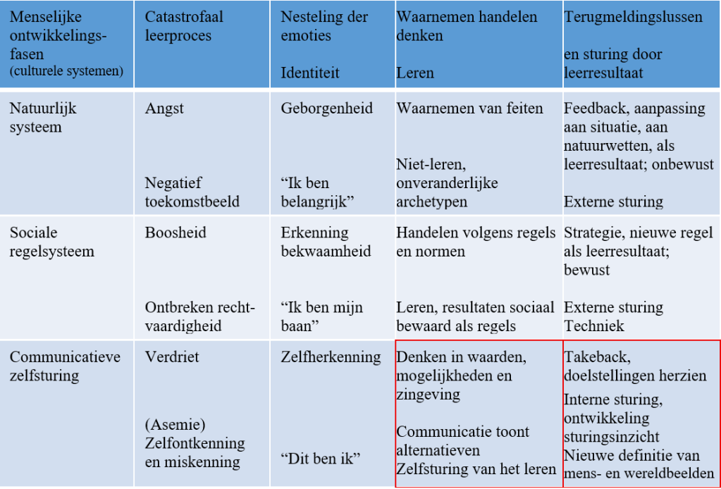 Ontwikkelingsfasen culturele systemen met catastrofale en gezonde leerprocessen volgens Cornelis
