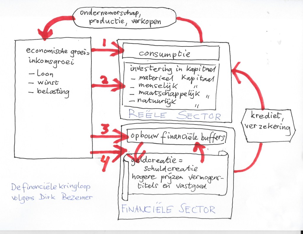 Sinds de vermogensmarkten zijn geliberaliseerd trekken ze makkelijk veel geld aan. Prijzen van vermogenstitels, bijvoorbeeld van aandelen, kunnen veel sneller stijgen dan winst uit productieprocessen. Financiële waarden zoals aandelen komen los te staan van de productieprocessen die ze vertegenwoordigen. Er wordt systematisch geld afgetapt door uitdijende vermogensmarkten. Zie de vierde rode pijl naar rechts. Er is geld genoeg. Maar we gebruiken het verkeerd. De overheid en de werkende mensen krijgen een steeds kleiner deel van de koek, mensen met vermogens een steeds groter deel. En er wordt volstrekt onvoldoende geïnvesteerd in de economie van de toekomst. Tot zover Bezemer.