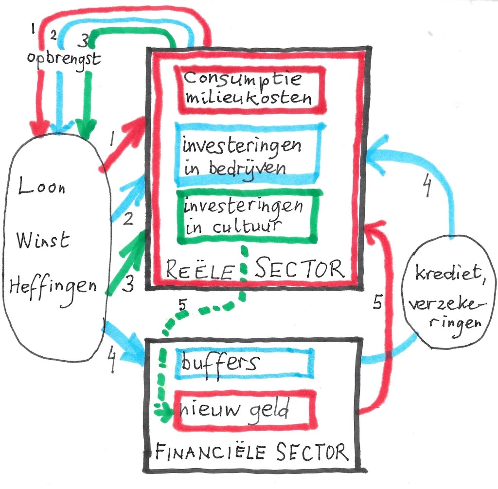 Nieuw geld is maatschappelijk inderdaad nuttig als er gewenste technologische innovaties mogelijk mee worden gemaakt. Denk bijvoorbeeld aan milieutechnologie. Maar helaas is het nu zo dat de financiële sector netto geld onttrekt aan de economie. Dirk Bezemer zegt hierover: “De financiële sector en de vermogensmarkten zijn juist de plekken geworden waar het proces van financiële duurzame groei spaak loopt.Stijgende prijzen van aan- delen en andere vermogenstitels en van vastgoed gaan steeds meer geld aantrekken, ook in de vorm van leningen en dus groei van schulden.“ Ik schreef eerder al een blog over het model van Bezemer ****). Dit geeft de relatie weer tussen de reële sector en de financiële sector. De rode pijlen zijn de drijvende krachten.