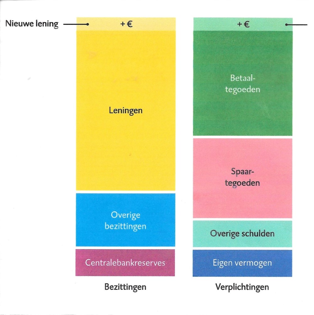 een bank een lening verstrekt, is de uitstaande lening een nieuwe bezitting voor de bank; de lener heeft nu een schuld dient deze met rente terug te betalen. Tegelijkertijd schrijft de bank een giraal tegoed bij op de rekening van de klant die de lening aangaat. Dit girale tegoed is een schuld van de bank aan de rekeninghouder; de rekeninghouder kan dit tegoed desgewenst opnemen in contanten. Als die dat doet moet de bank hiervoor dekking zoeken op de kapitaalmarkt (overige schulden). Als de lening wordt afbetaald, verdwijnt het daartoe geschapen geld ook weer. Ondertussen heeft de bank daar wel winst op gemaakt.